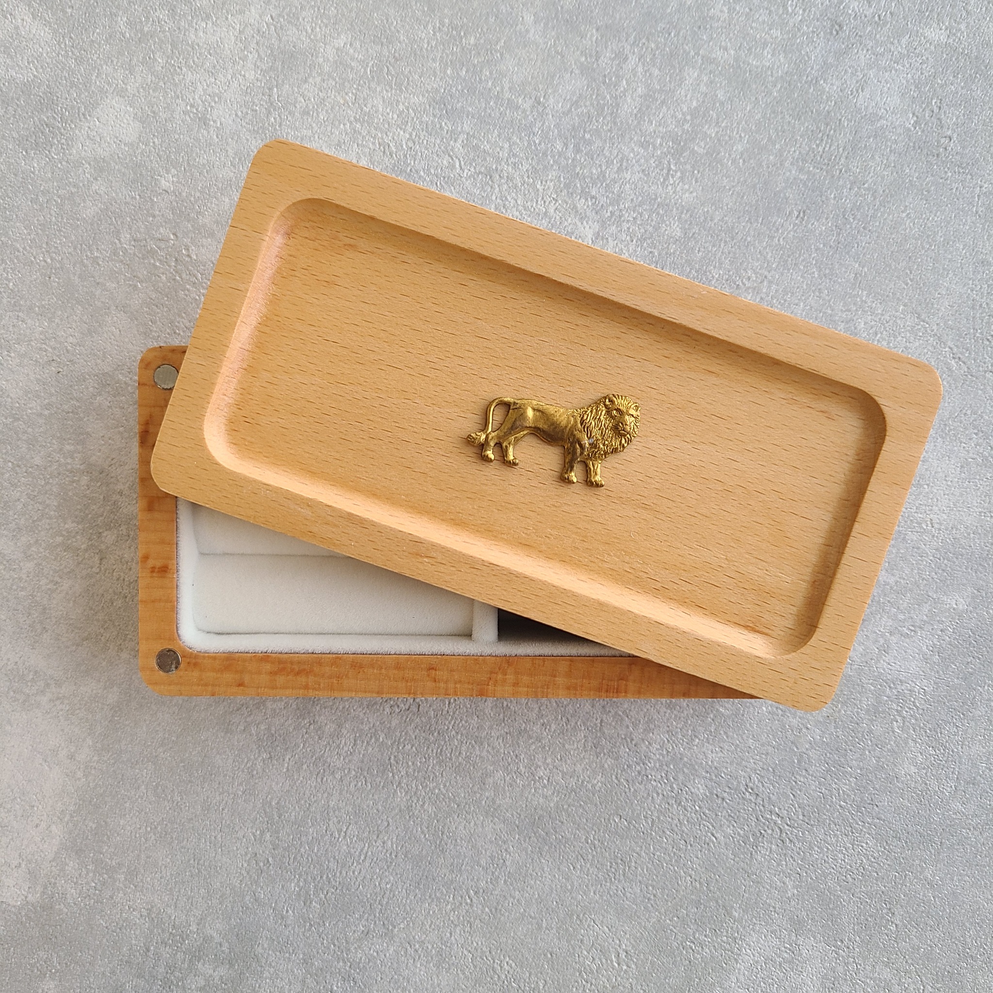 手のひらサイズのナチュラルな木製ケースに、堂々としたライオンの真鍮が添えられています。