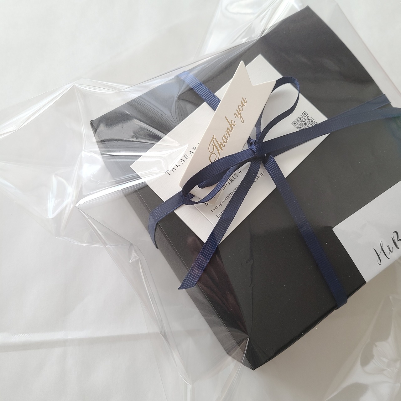 ギフトラッピングは無料で、黒いリボン付きの上品な袋でお届けします。