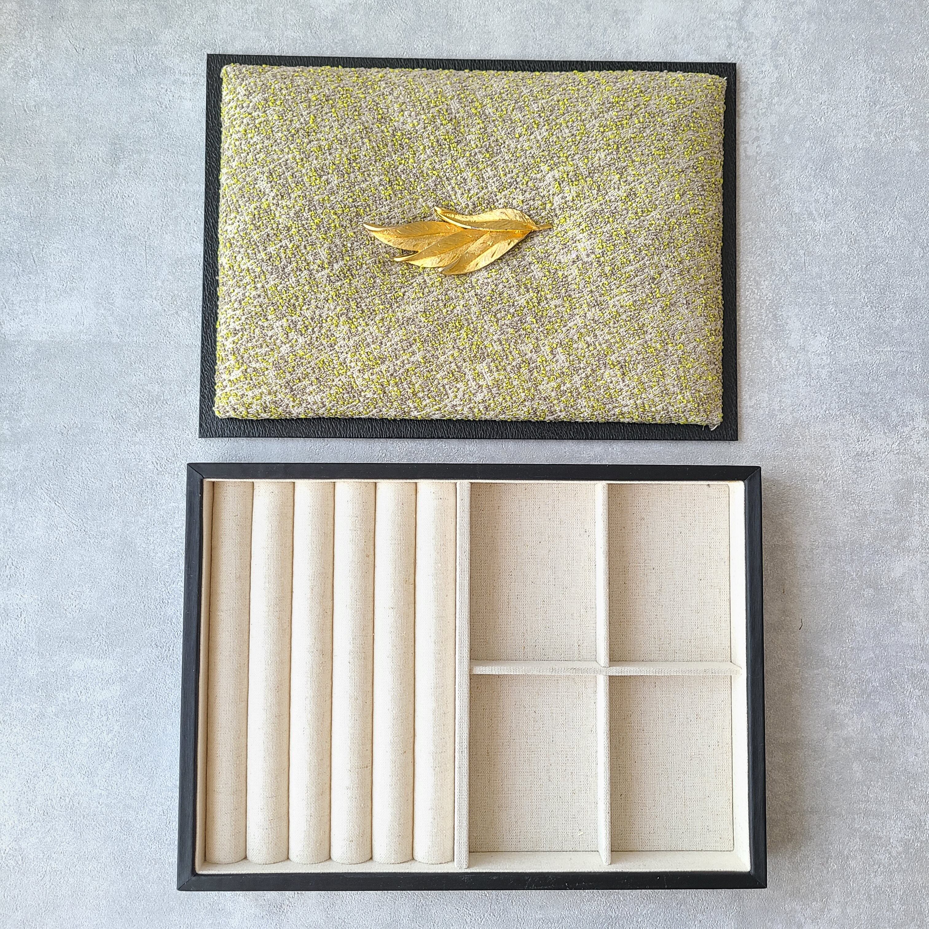 葉っぱをモチーフにしたヴィンテージブローチをリメイクした1点物のジュエリーボックスです。少し個性的なものがお好きな大人の女性にお勧めのジュエリーボックス。