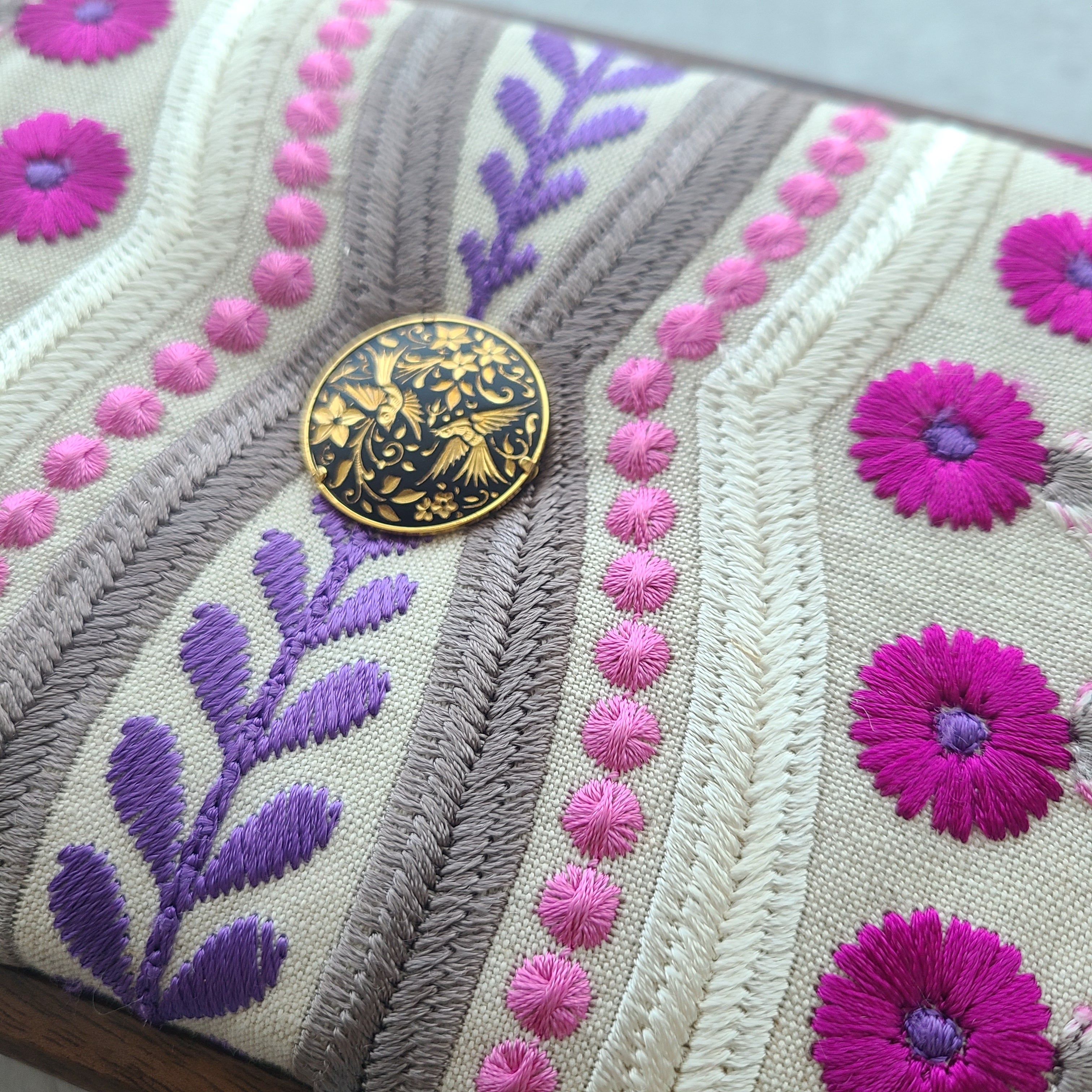 こちらは、ヴィンテージ蜂モチーフのチャーム × 意匠性の高い刺繍インポート生地 を組み合わせた、一点物の木製ジュエリーボックスです。