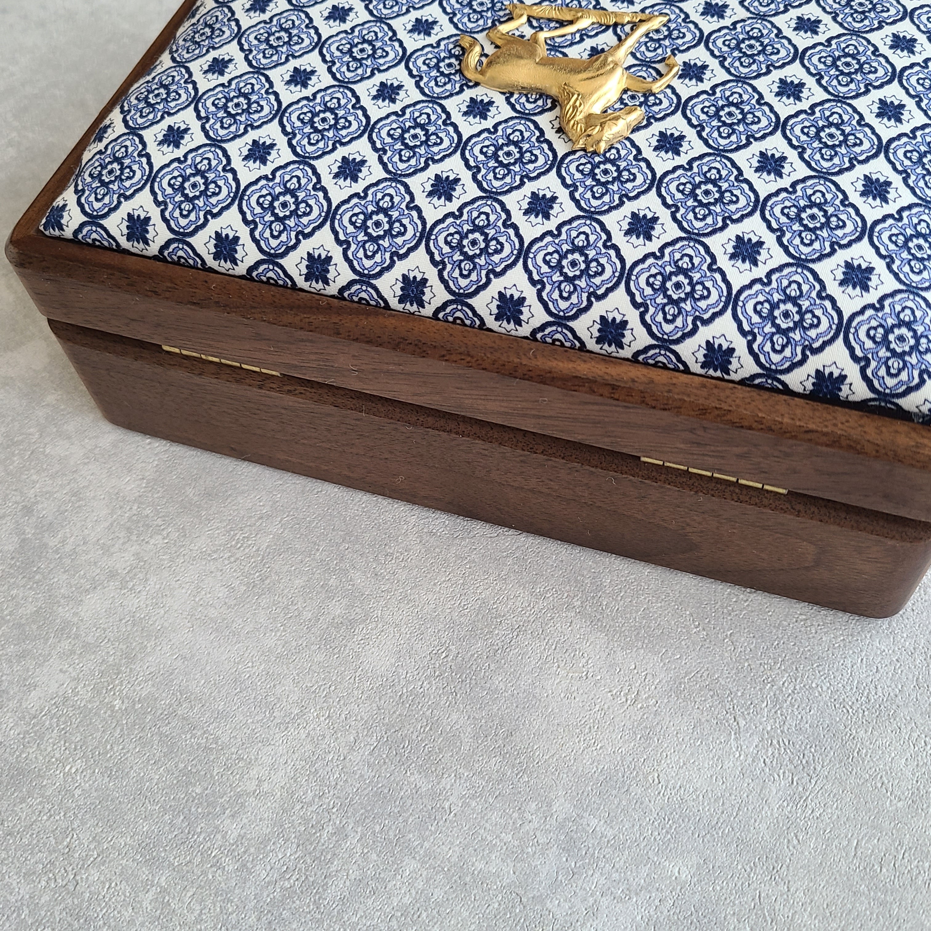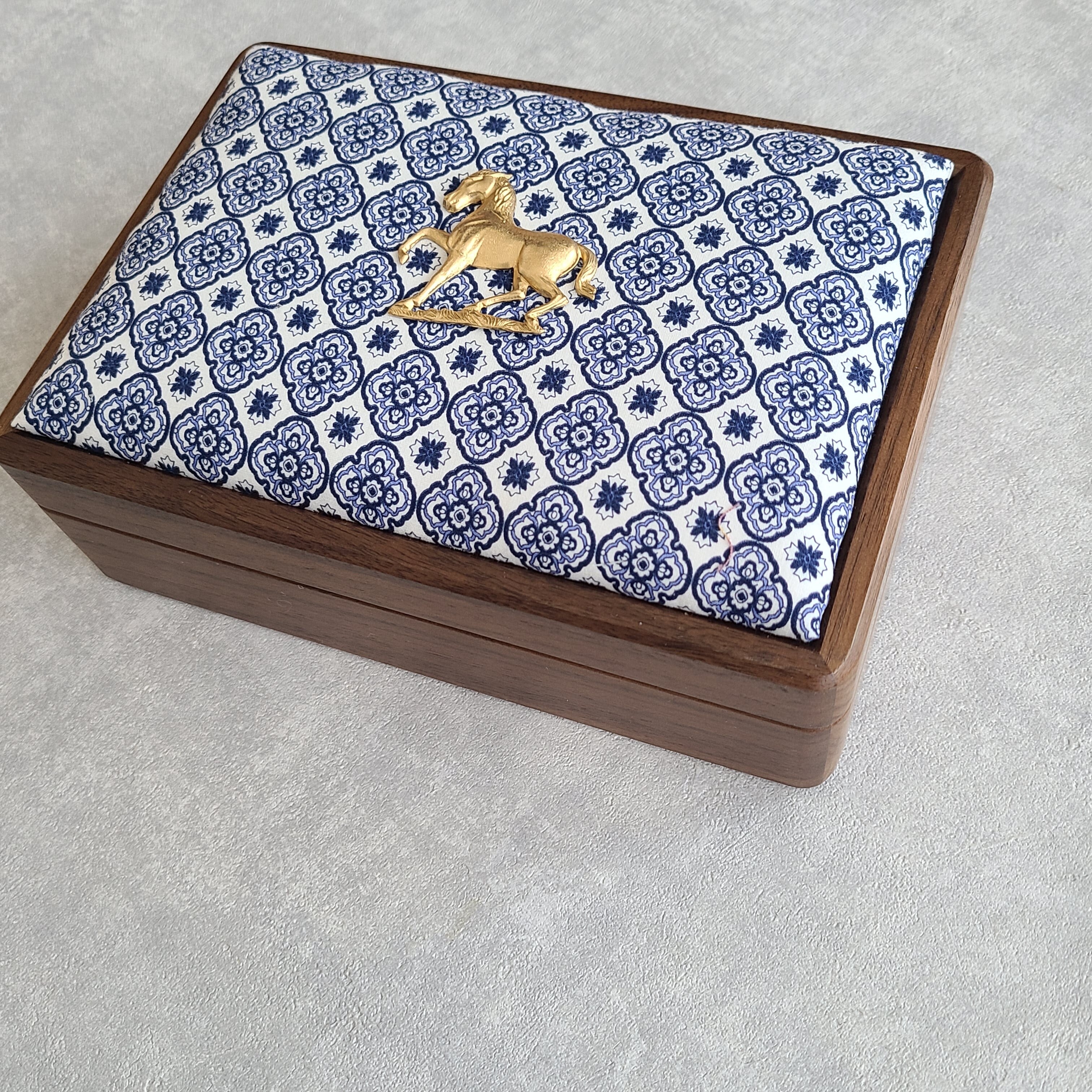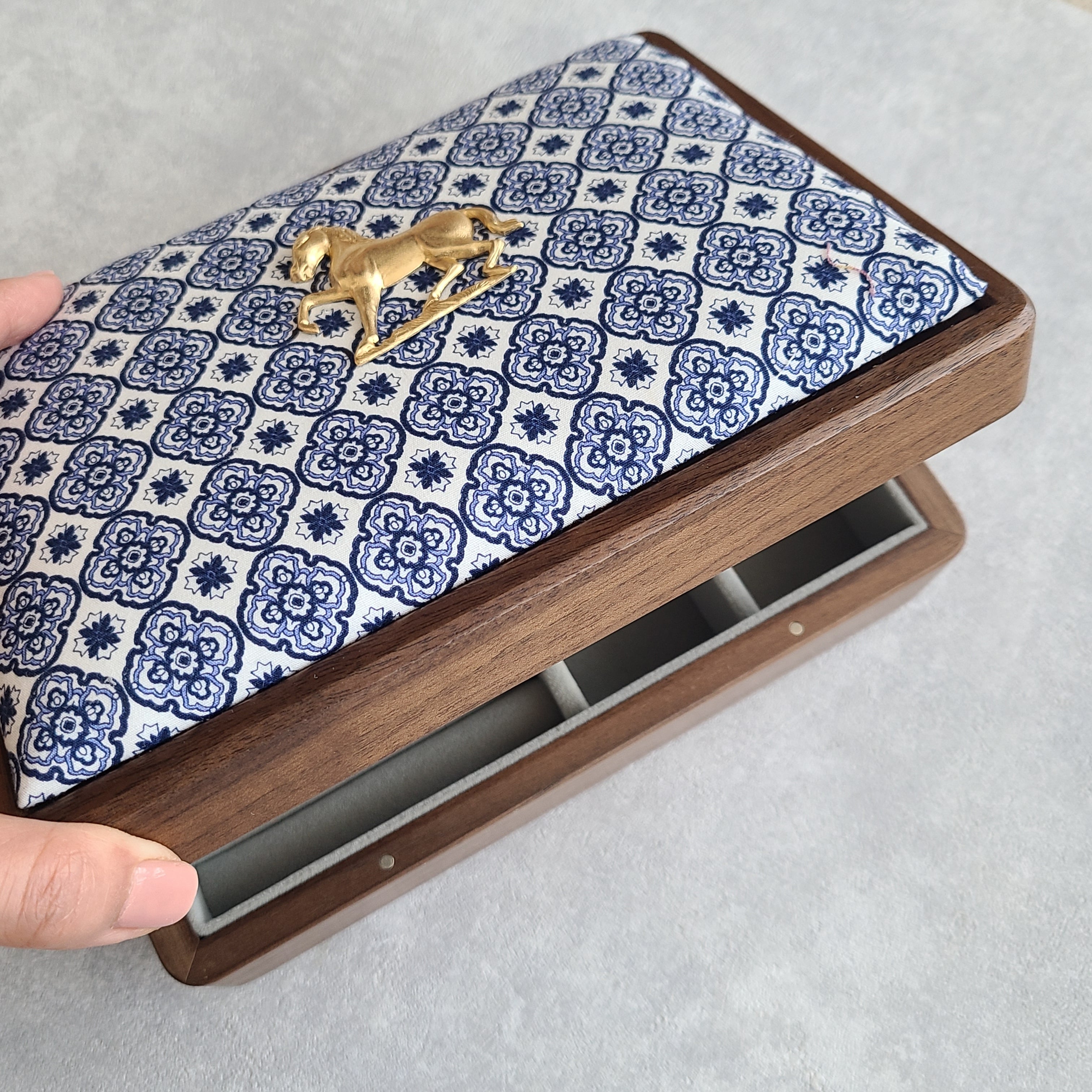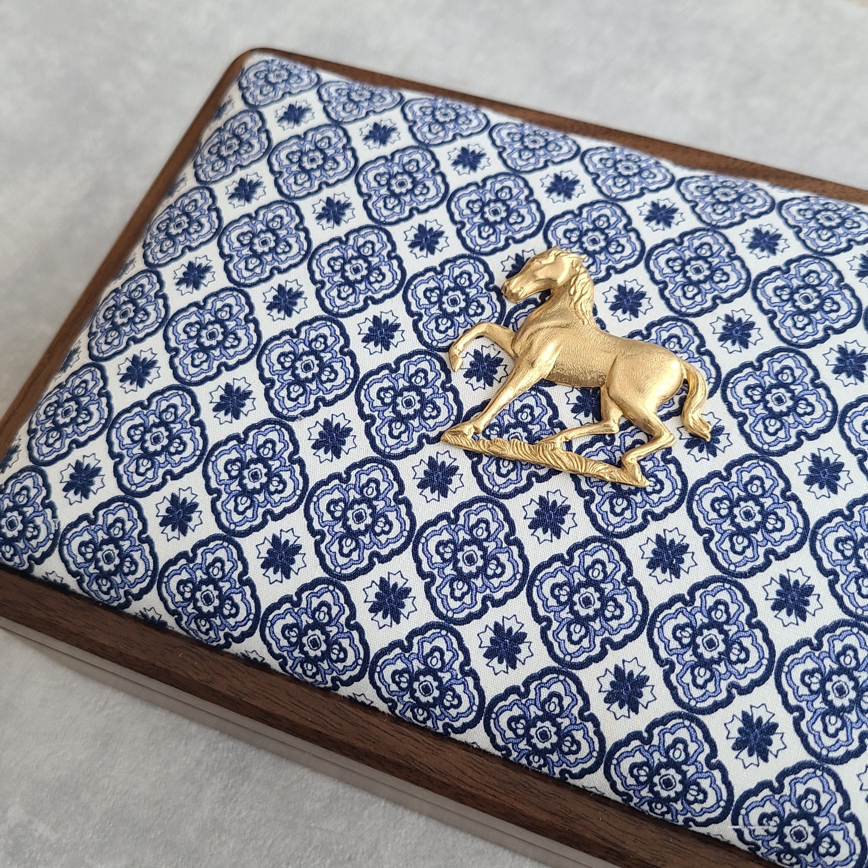 <予約受付中>【お馬さんモチーフのチャーム付き】木製ジュエリーボックス|ブルーのオリエンタル小紋柄|男女兼用