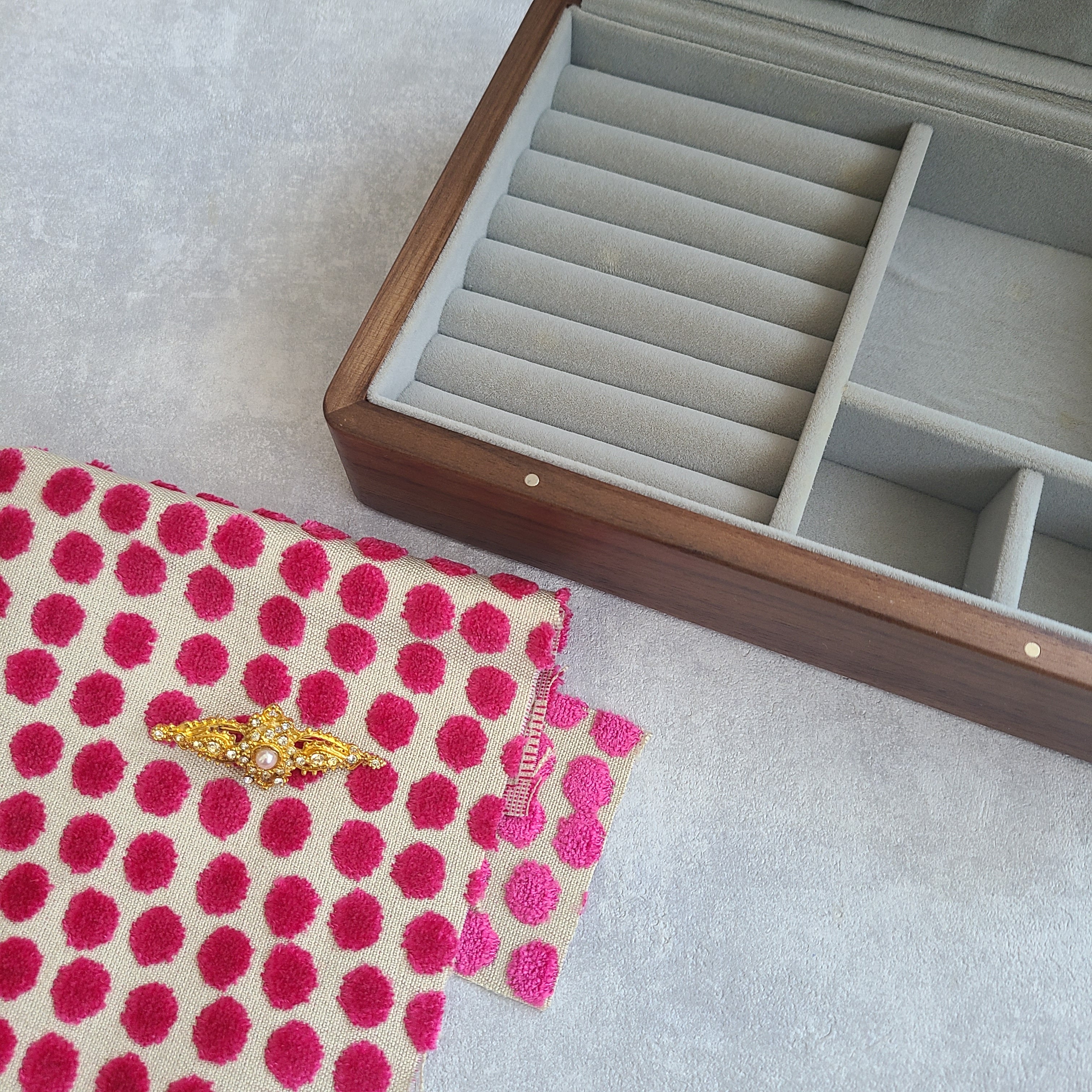 さらに、存在感のあるヴィンテージブローチを丁寧にリメイクし、世界にひとつだけの特別なジュエリーボックスに仕立てました。