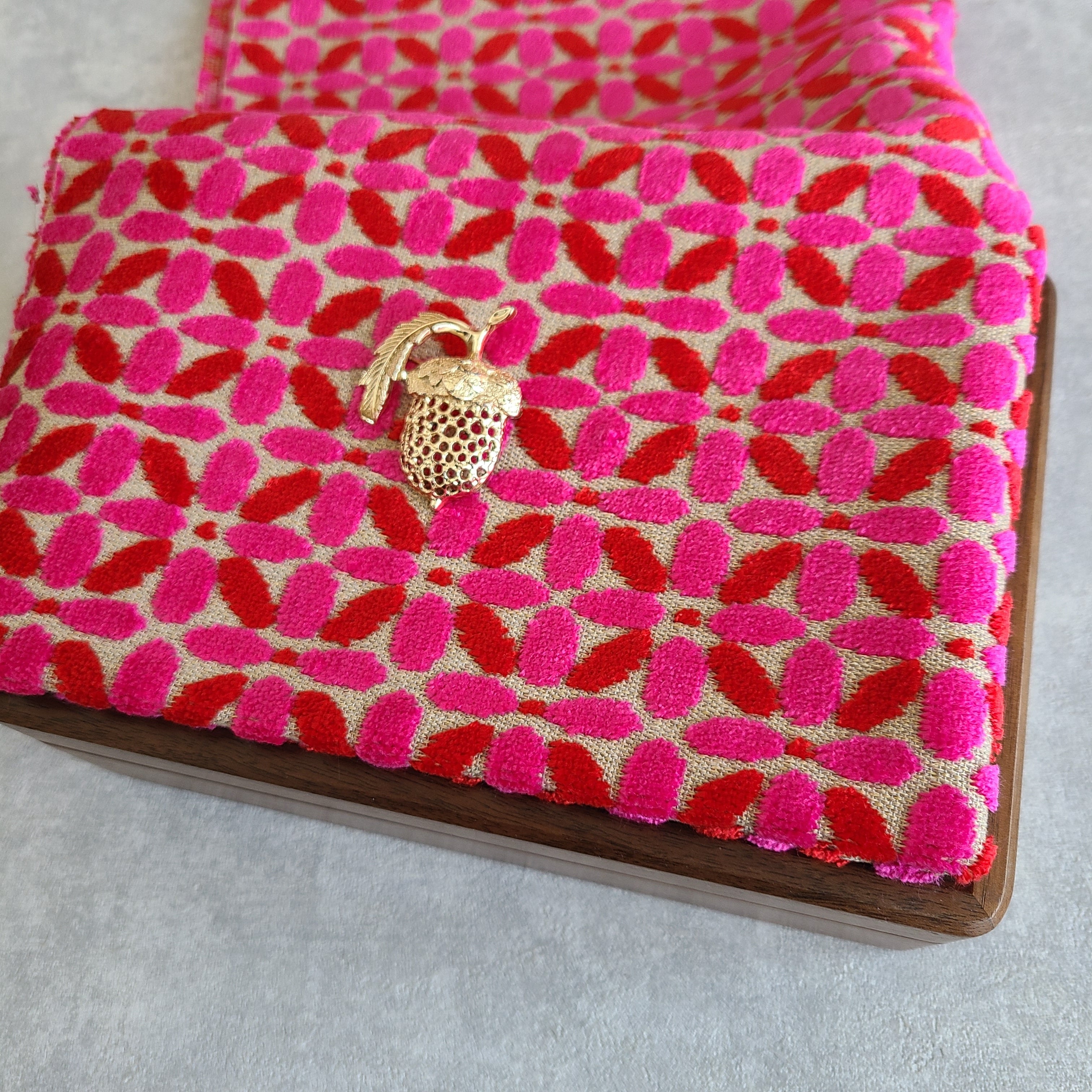 こちらは、ヴィンテージ蜂モチーフのチャーム × 意匠性の高い刺繍インポート生地 を組み合わせた、一点物の木製ジュエリーボックスです。