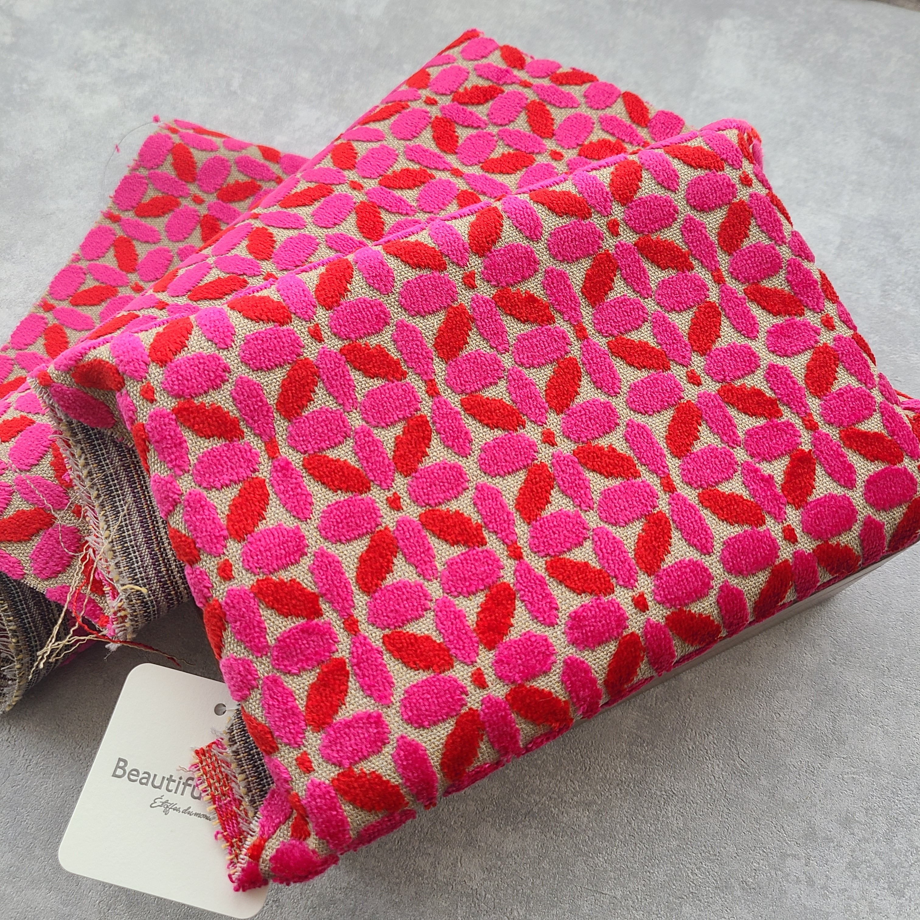 蓋部分には、長年テキスタイルデザイナーとして活躍してきた作り手がコレクションの中から厳選した、高級インテリアにも使われる刺繍インポート生地を使用。