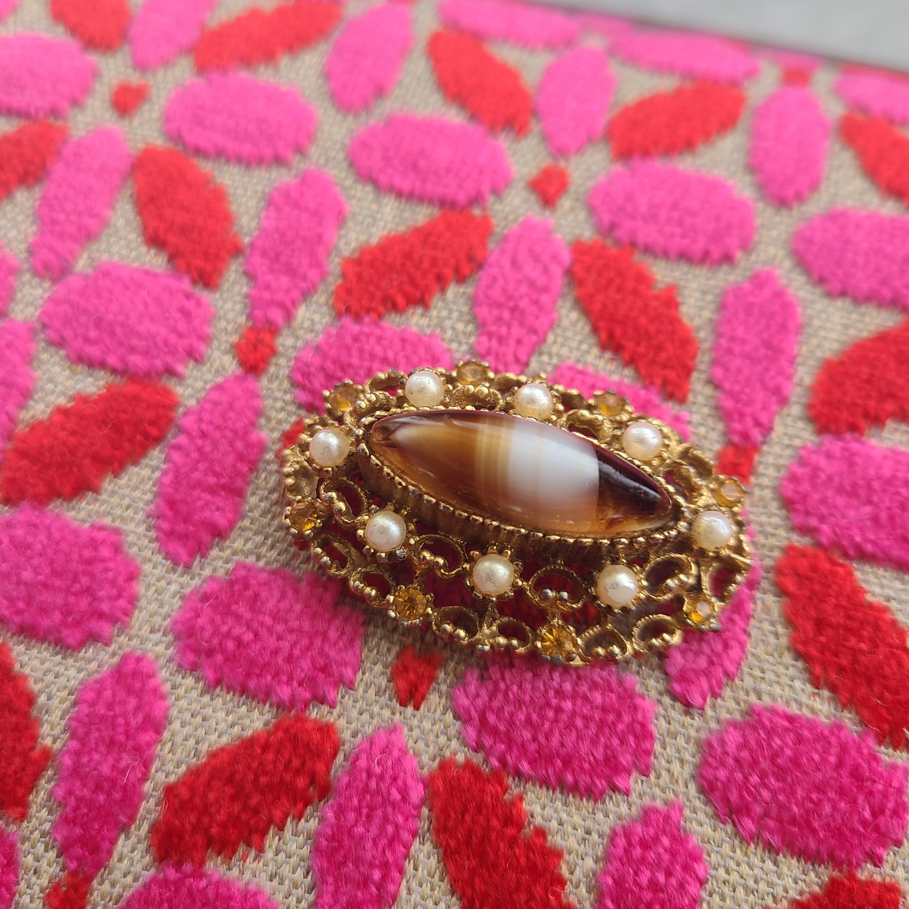 フェイクパールと細工が美しいイギリスのヴィンテージブローチをリメイクしました。ピンクのインポート生地と合間って、華やかながらも大人っぽくて上品な印象に仕上がりました。、