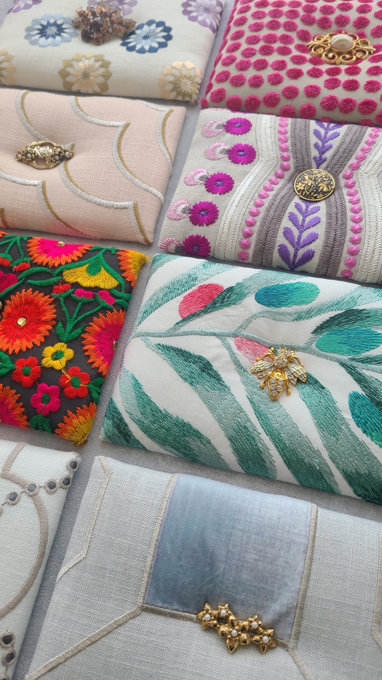 蓋部分には、長年テキスタイルデザイナーとして活躍してきた作り手がコレクションの中から厳選した、高級インテリアにも使われる刺繍インポート生地を使用。