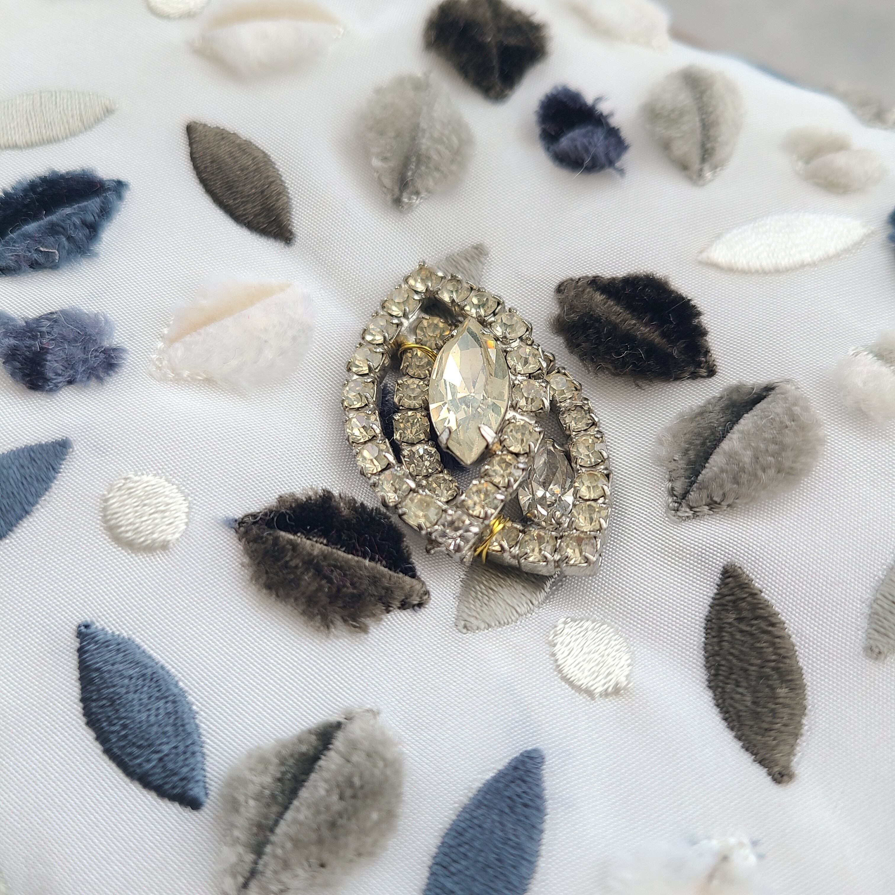 (ヴィンテージブローチをリメイクしておりますので、シルバーやビジュー部分に若干のくすみや剥げがございますのでご了承ください。デザイナーが見て、許容範囲の物のみ使用しております。)
